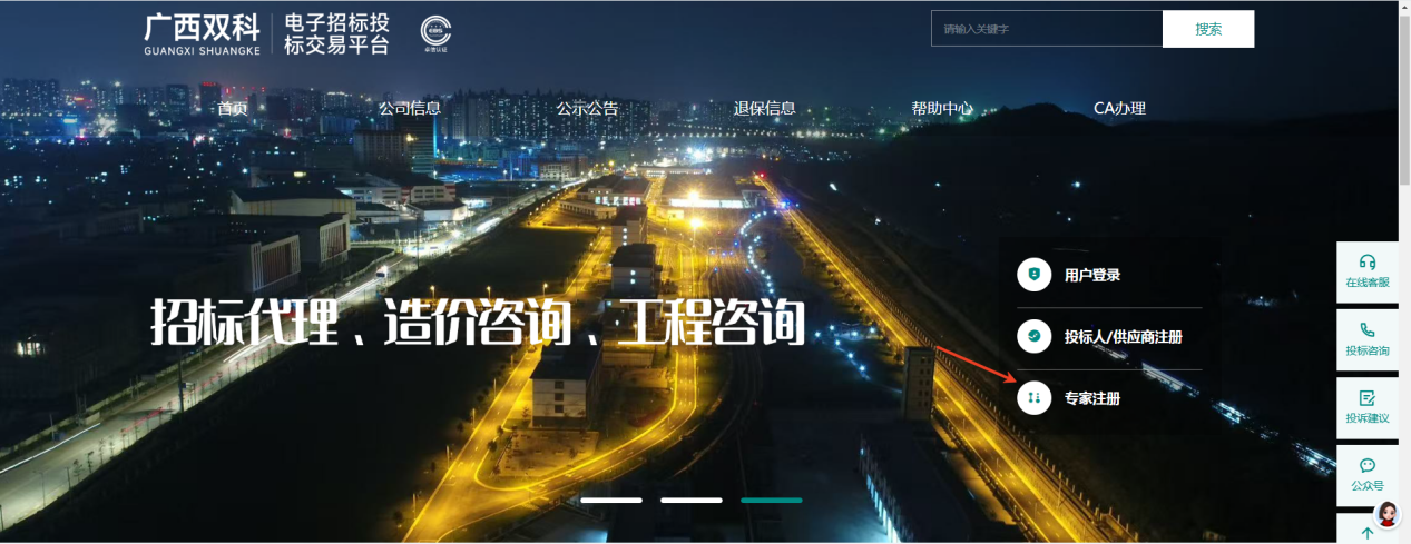 1、专家注册:请登录广西双科电子招标投标交易平台(以下简称平台)(https://gxsk.zcjb.com.cn/),在首页找到【专家注册】按钮,进入注册页面后选择类型为“专家”,按照要求填入基本信息,点击【提交审批】完成注册。